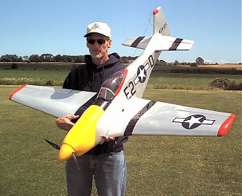 ![]() "Mmmmmm Mustang" as Homer would say... P51 Mustang - "Detroit Miss" 1/7 scale model, 65 in. span, 650 sq.in. wing area, 6.25 lb., geared Astro 25 cobalt(1.7/1), 16 CP2400 nicads,15x9 prop 40amp.All blue foam construction |