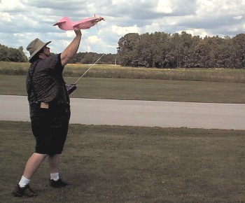 classic launching pose, sartorial elegance in action. The model is a pink foam twin motored pseudo fighter thingie. I think I need to get more details. Charles said it is set up for indoor, however he managed quite nicely in our almost calm conditions in the morning. |